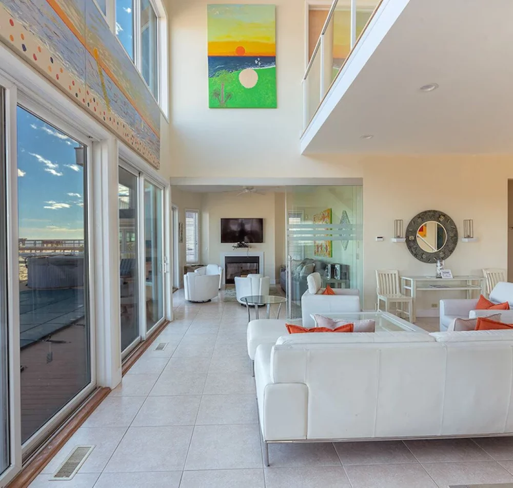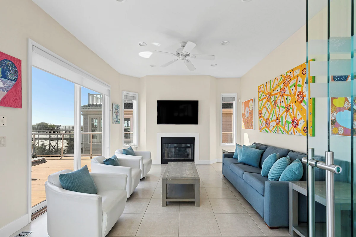 Our 6-bedroom oceanfront home at 819 Dune Road sleeps 12 across two levels and several balconies.